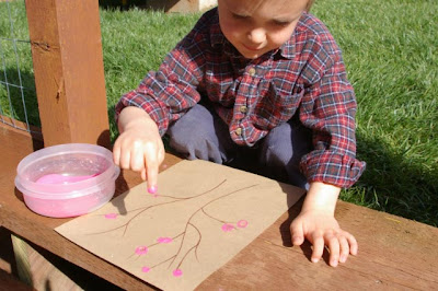 We finger-print painted cherry trees today in honor of spring. I had a conversation with myself before hand and we agreed (myself and I?) that I was prepared to accept whatever the kids decided to do with their finger-print painting experience...it's hard to let go of that sometimes, isn't it?Big Bird chose to make several individual cherry blossoms on the branches that I had drawn for him. Baby Bird chose a different path and turned it into a full body experience. She started by painting her hands and then moved up to her head! Good thing I had that conversation with myself before we started ;)